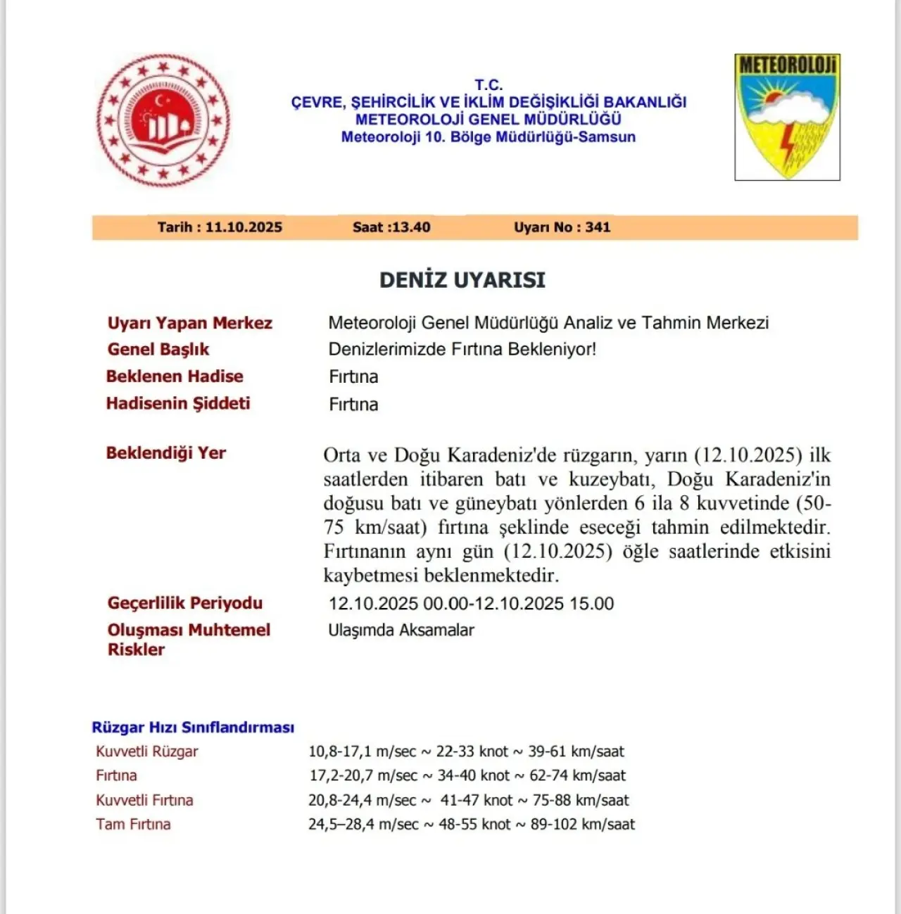 Meteoroloji'nin son değerlendirmelerine göre, yarın sabahın ilk saatlerinden itibaren Orta ve Doğu Karadeniz’de rüzgarın batı ve kuzeybatı yönlerinden, Doğu Karadeniz’in doğusunda ise batı ve güneybatı yönlerinden 6 ila 8 kuvvetinde (50-75 km/s) fırtına şeklinde eseceği tahmin ediliyor.