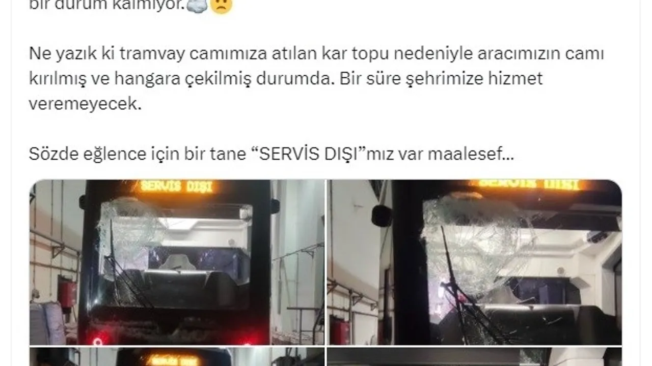 "Hepimiz çocuklar gibi sevinelim, kartopuyla eğlenelim kabul. Ama kartopunun içine taş sıkıştırıp tramvaya atılınca çok da eğlencelik bir durum kalmıyor. Ne yazık ki tramvay camımıza atılan kartopu nedeniyle aracımızın camı kırılmış ve depoya çekilmiş durumda. Bir süre şehrimize hizmet veremeyecek. Sözde eğlence için bir tane ‘servis dışı’mız var maalesef"