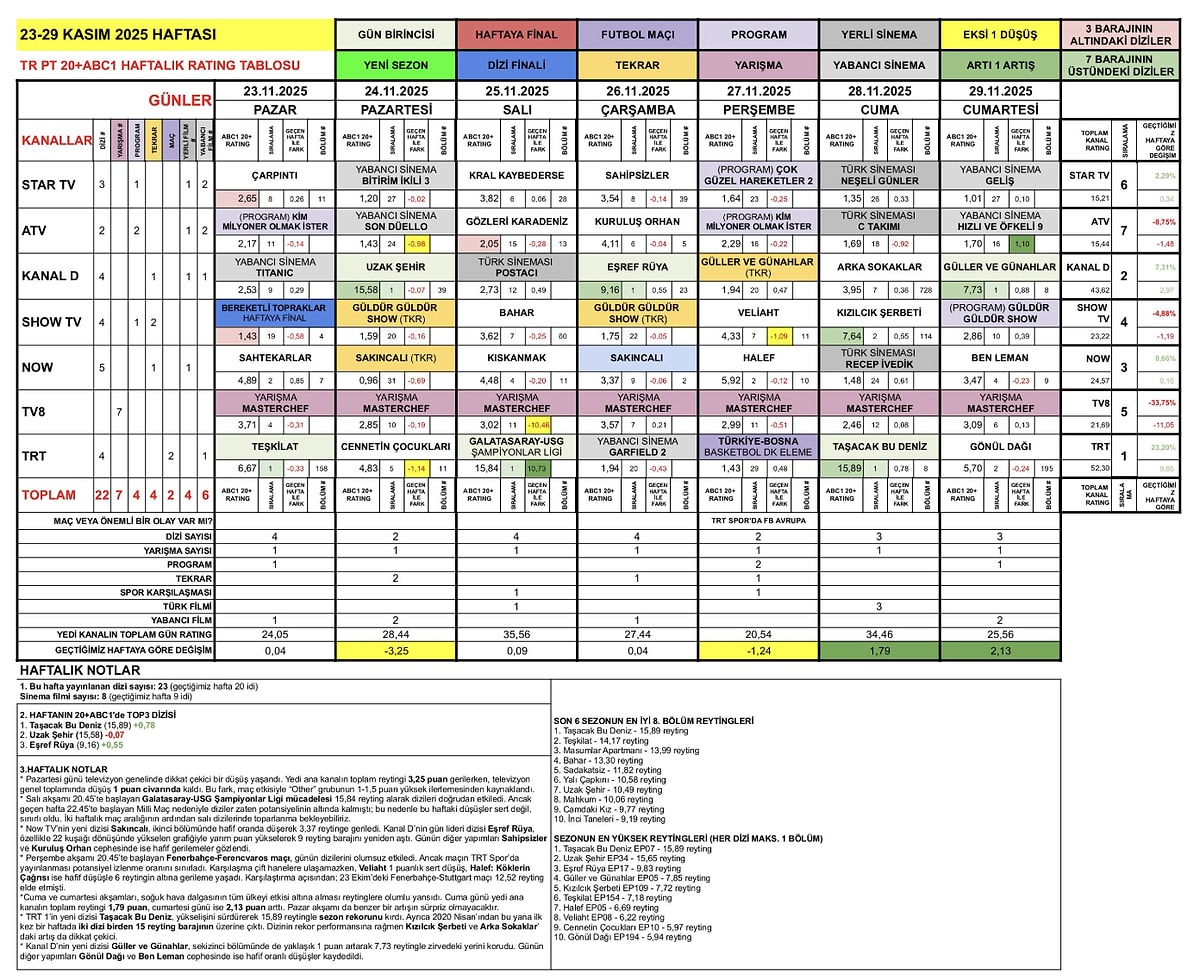 Özellikle Uzak Şehir ve Taşacak Bu Deniz’in aynı gün 15 reyting barajını aşması, ekranlarda sert bir rekabet yaşandığını gözler önüne serdi. Haftanın diğer güçlü yapımları Eşref Rüya, Kızılcık Şerbeti ve Güller ve Günahlar da yüksek izlenme oranları alarak bu yarışa dahil oldu.