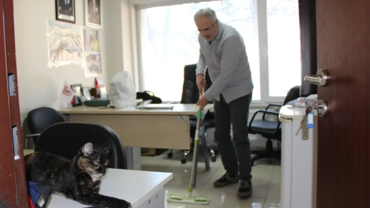 Odanın günlük temizliğini yapıp elleriyle silip süpüren Prof. Dr. Ahmet Dursun, aynı ortamı paylaştığı can dostlarının sürekli girip çıkmalarını da sağlamak amacıyla odasının kapısına aralığını kedileri için ayarladığı asma kilit taktırdı. Öğrenciler ise "Yok böyle bir profesör" sözleriyle kutladıkları hocalarını örnek aldı.