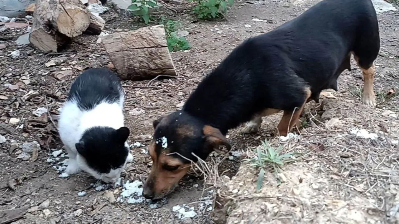 Birlikte yemek yiyen kedi ve köpek, kendilerine ikram edilen yiyecekleri bitirdikten sonra birbirlerinden uzaklaşarak farklı yönlere doğru ilerlediler.