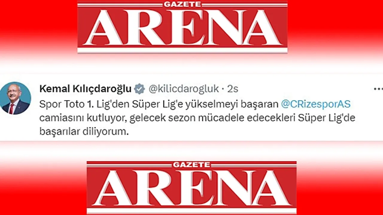 Süper Toto 1. Lig'in 38. haftasında Çaykur Rizespor, sahasında karşıladığı Altınordu ile 0-0 berabere kalmasının ardından Süper Lig'e yükseldi. Cumhurbaşkanı adayı ve Cumhuriyet Halk Partisi (CHP) Genel Başkanı Kemal Kılıçdaroğlu sosyal medya hesabından Rizespor’un Süper Lig'e çıkışını kutladı. Kılıçdaroğlu mesajında, "Spor Toto 1. Lig’den Süper Lig'e yükselmeyi başaran Çaykur Rizespor camiasını kutluyor. Gelecek sezon mücadele edecekleri Süper Lig'de başarılar diliyorum” ifadelerine yer verdi.