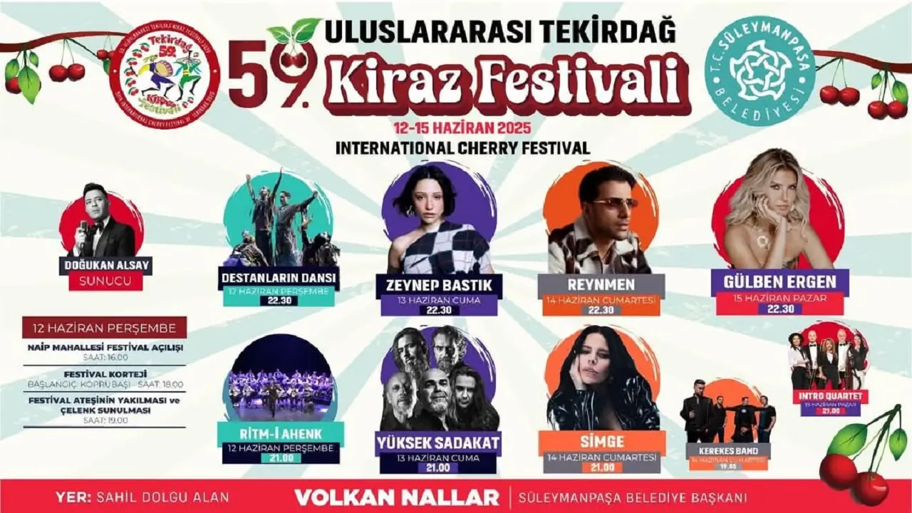 4 gün sürecek 59. Uluslararası Tekirdağ Kiraz Festivali’nde birbirinden ünlü sanatçılar konser verecek. Halkın müziğe ve eğlenceye doyacağı etkinliğin programı da belli oldu.