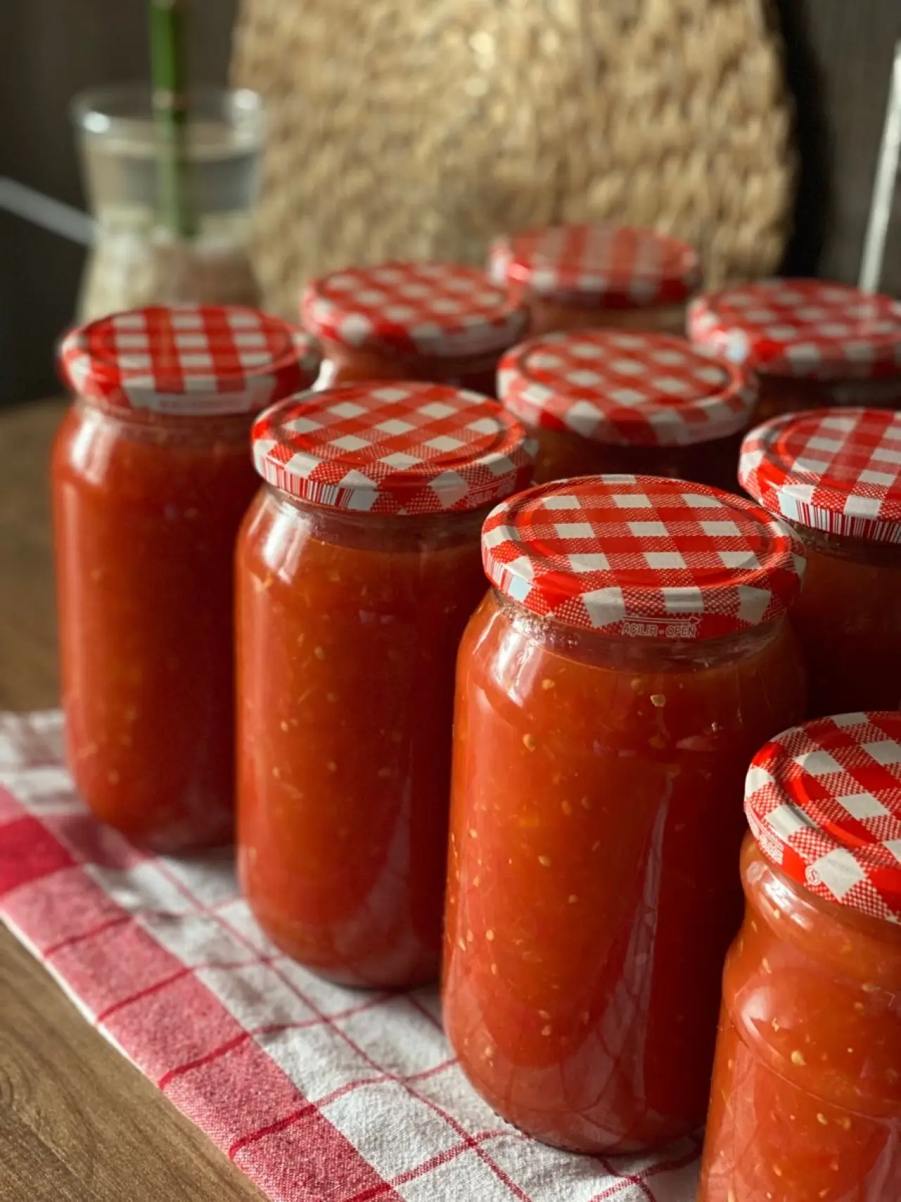 4. Kavanozlama: Kaynar haldeki domatesler dikkatlice sıcak kavanozlara doldurulur. Her kavanozun üst kısmında yaklaşık bir parmak boşluk bırakılmalıdır.