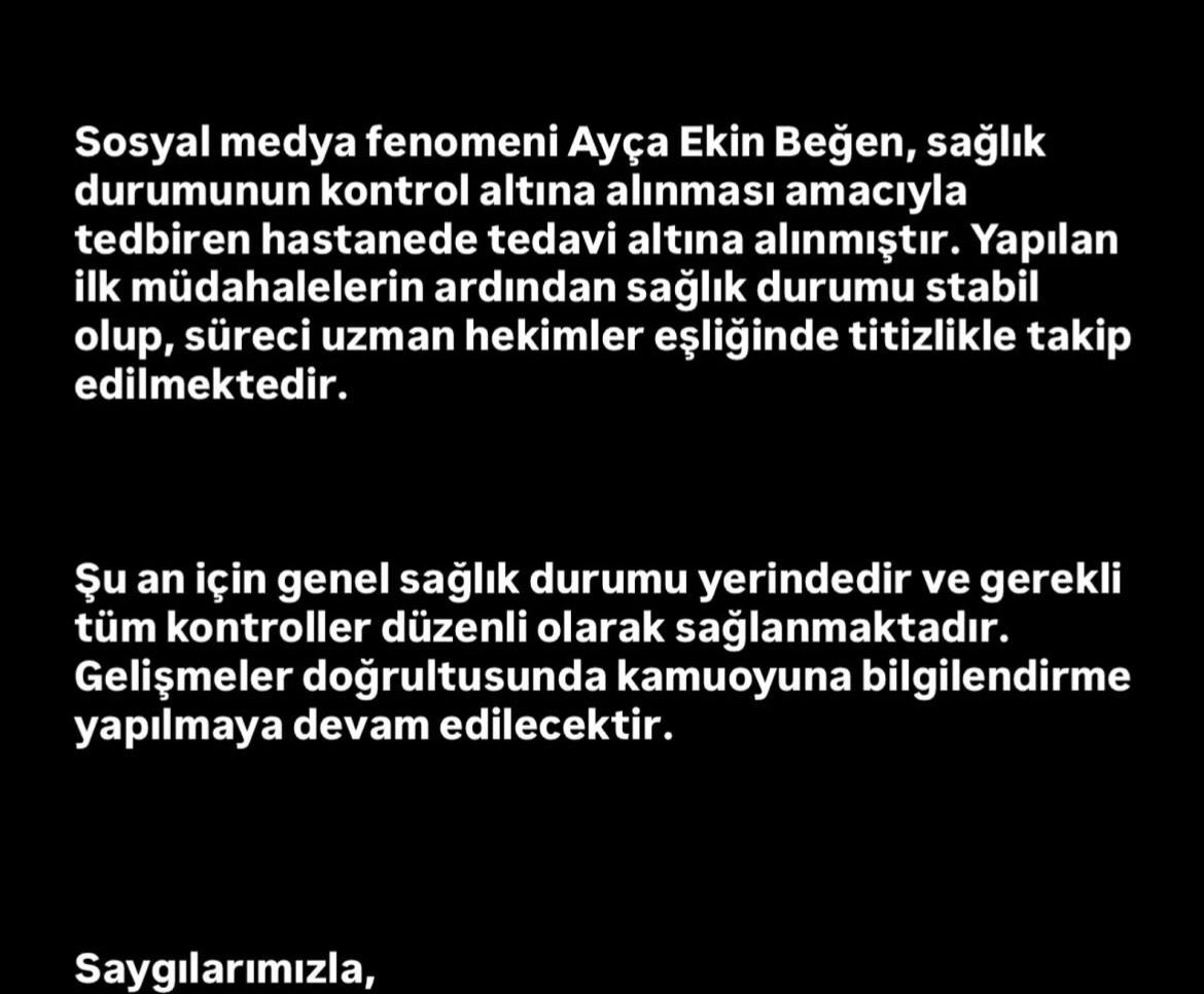 Öte yandan Beğen’in sosyal medya hesabından yapılan açıklamada, sağlık durumunun kontrol altına alındığı belirtildi. Açıklamada, “Kendisi şu an hastanede tedavi altında olup, gerekli tüm tıbbi müdahaleler uzman ekipler tarafından titizlikle sürdürülmektedir. Genel sağlık durumu kontrol altına alınmış olup, sürecin olumlu yönde ilerlediğini belirtmek isteriz” ifadelerine yer verildi.