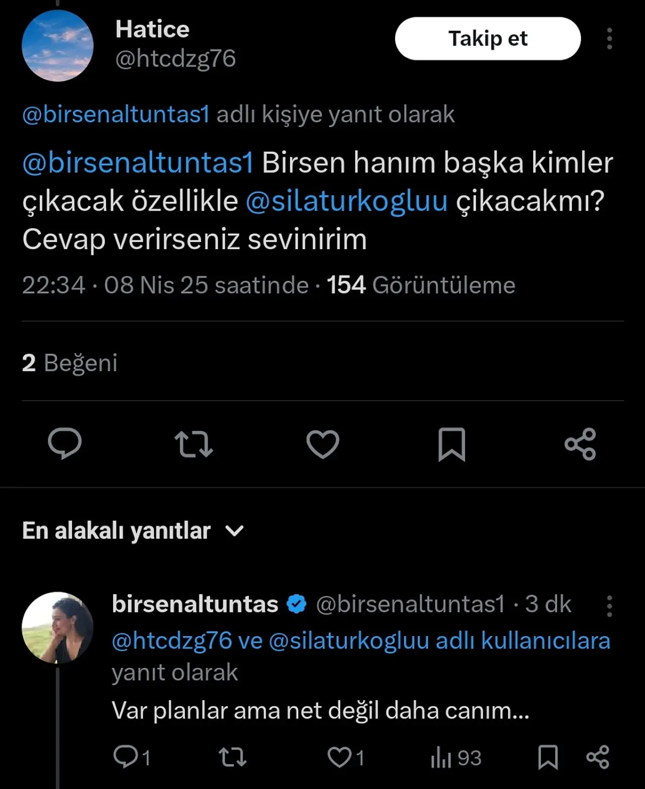 'Birsen hanım başka kimler çıkacak özellikle Sıla Türkoğlu çıkacak mı? Cevap verirseniz sevinirim.' şeklindeki soruya Altuntaş, 'Var planlar ama net değil daha canım...' şeklinde cevap verdi.