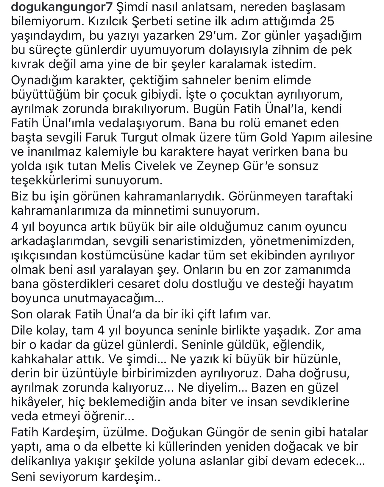 “Şimdi nasıl anlatsam, nereden başlasam bilemiyorum. Kızılcık Şerbeti setine ilk adım attığımda 25 yaşındaydım, bu yazıyı yazarken 29’um. Zor günler yaşadığım bu süreçte günlerdir uyumuyorum, dolayısıyla zihnim de pek kıvrak değil ama yine de bir şeyler karalamak istedim. Oynadığım karakter, çektiğim sahneler benim elimde büyüttüğüm bir çocuk gibiydi. İşte o çocuktan ayrılıyorum, ayrılmak zorunda bırakılıyorum. Bugün Fatih Ünal’la, kendi Fatih Ünal’ımla vedalaşıyorum. Bana bu rolü emanet eden başta sevgili Faruk Turgut olmak üzere tüm Gold Yapım ailesine ve inanılmaz kalemiyle bu karaktere hayat verirken bana bu yolda ışık tutan Melis Civelek ve Zeynep Gür’e sonsuz teşekkürlerimi sunuyorum. Biz bu işin görünen kahramanlarıydık. Görünmeyen taraftaki kahramanlarımıza da minnetimi sunuyorum. Dört yıl boyunca artık büyük bir aile olduğumuz canım oyuncu arkadaşlarımdan, sevgili senaristimizden, yönetmenimizden, ışıkçısından kostümcüsüne kadar tüm set ekibinden ayrılıyor olmak beni asıl yaralayan şey. Onların bu en zor zamanımda bana gösterdikleri cesaret dolu dostluğu ve desteği hayatım boyunca unutmayacağım. Son olarak Fatih Ünal’a da bir iki çift lafım var. Dile kolay, tam dört yıl boyunca seninle birlikte yaşadık. Zordu ama bir o kadar da güzel günlerdi. Seninle güldük, eğlendik, kahkahalar attık. Ve şimdi… Ne yazık ki büyük bir hüzünle, derin bir üzüntüyle birbirimizden ayrılıyoruz. Daha doğrusu ayrılmak zorunda kalıyoruz. Bazen en güzel hikâyeler hiç beklemediğin anda biter ve insan sevdiklerine veda etmeyi öğrenir. Fatih kardeşim, üzülme. Doğukan Güngör de senin gibi hatalar yaptı ama o da elbette ki küllerinden yeniden doğacak ve bir delikanlıya yakışır şekilde yoluna aslanlar gibi devam edecek. Seni seviyorum kardeşim…”