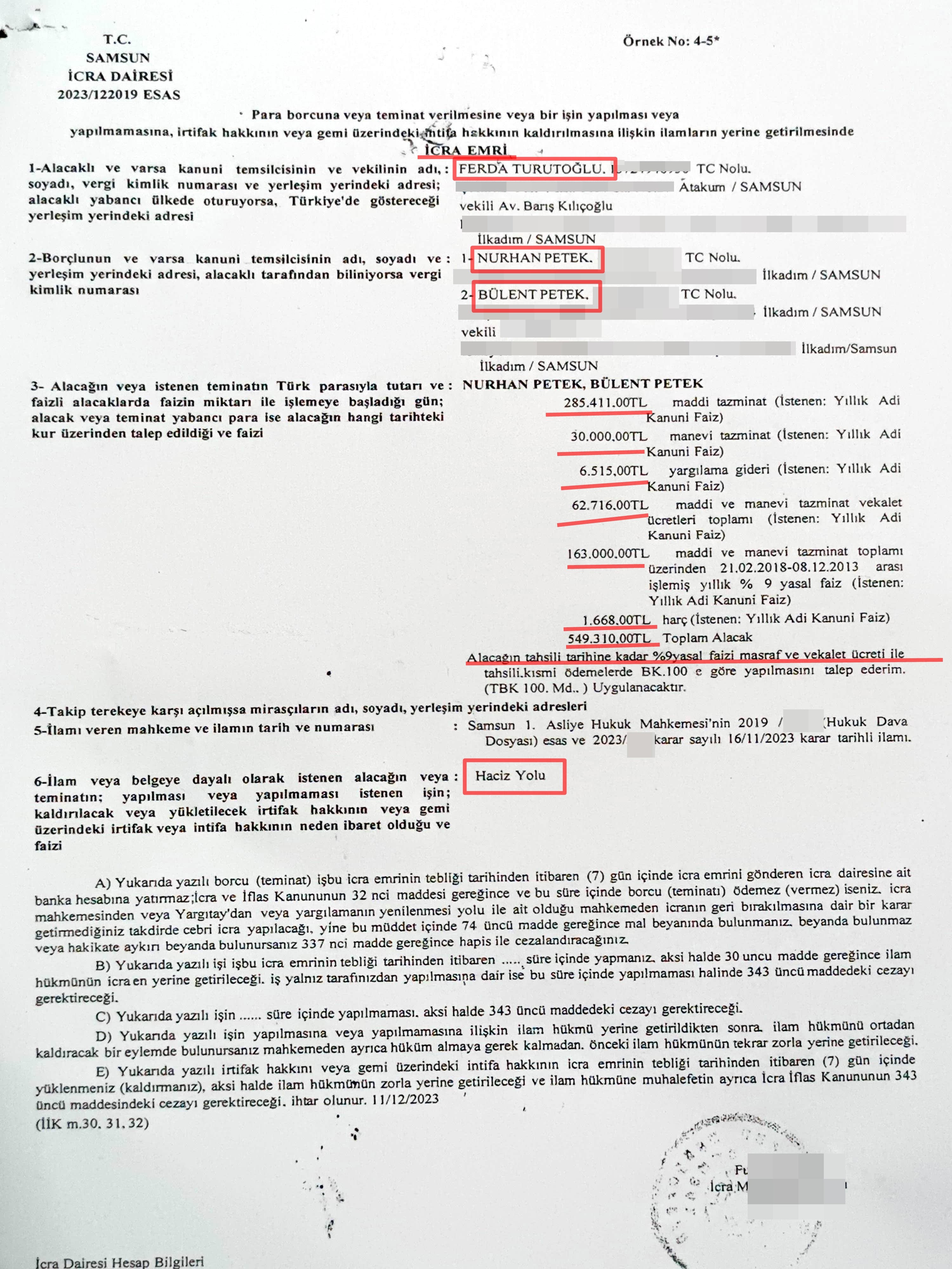 Samsun 1. Asliye Hukuk Mahkemesi, Dr. Ferda Turutoğlu'nun açtığı maddi ve manevi tazminat davasında lehine karar verdi. Mahkeme davacıyı haklı bularak Petek çiftini 285 bin 441 TL maddi tazminat, 30 bin TL manevi tazminat, 21 bin TL karar-ilam harcı gideri, bin 668 TL harç yargılama gideri, 6 bin 515 TL yargılama gideri, 44 bin 816 TL vekalet ücreti ve 17 bin 900 TL vekalet ücretinin yasal faizleri ile birlikte toplam 465 bin 976 TL para cezasına çarptırdı.