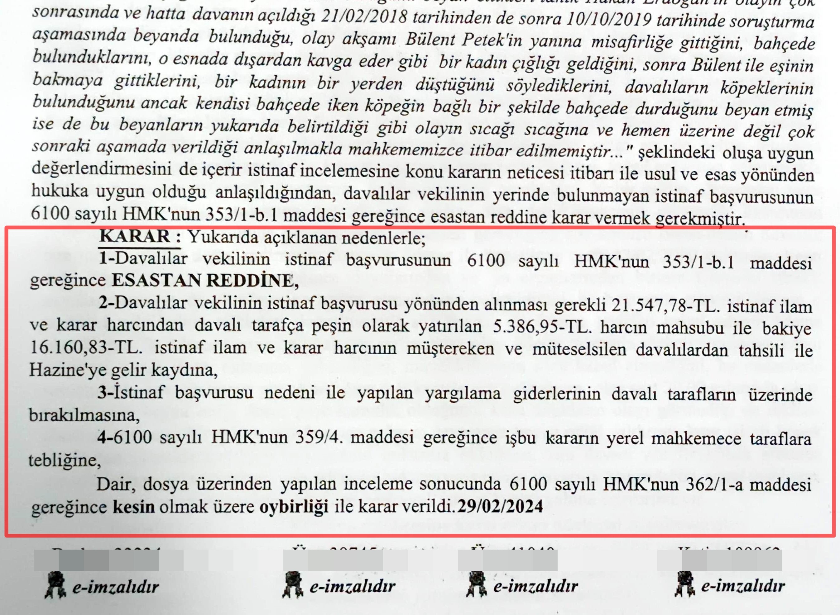 Petek çifti kararı istinafa taşıdı. Petek ailesinin talebi Bölge Adliye Mahkemesi 5. Hukuk Dairesi tarafından da bozulmadı. İstinaf kararında davalı tarafın istinaf başvurusunun 'esastan reddine' hükmedildi. Bölge Adliye Mahkemesi'nin 29 Şubat 2024 tarihinde verdiği kararında "Dosya üzerinde yapılan inceleme sonucunda 6100 sayılı HMK'nın 362/1 maddesi gereğince kesin olmak üzere oybirliği ile karar verildi" denildi. Kararın kesinleşmesinin ardından davacı tarafından, davalıya toplam 549 bin 310 TL'lik haciz gönderildi. Yasal faizleri ile birlikte yaklaşık 700 bin TL cezaya mahkum edildiğini belirten davalı Bülent Petek, yaptığı basın açıklamasında mahkemenin verdiği kararları eleştirdi.