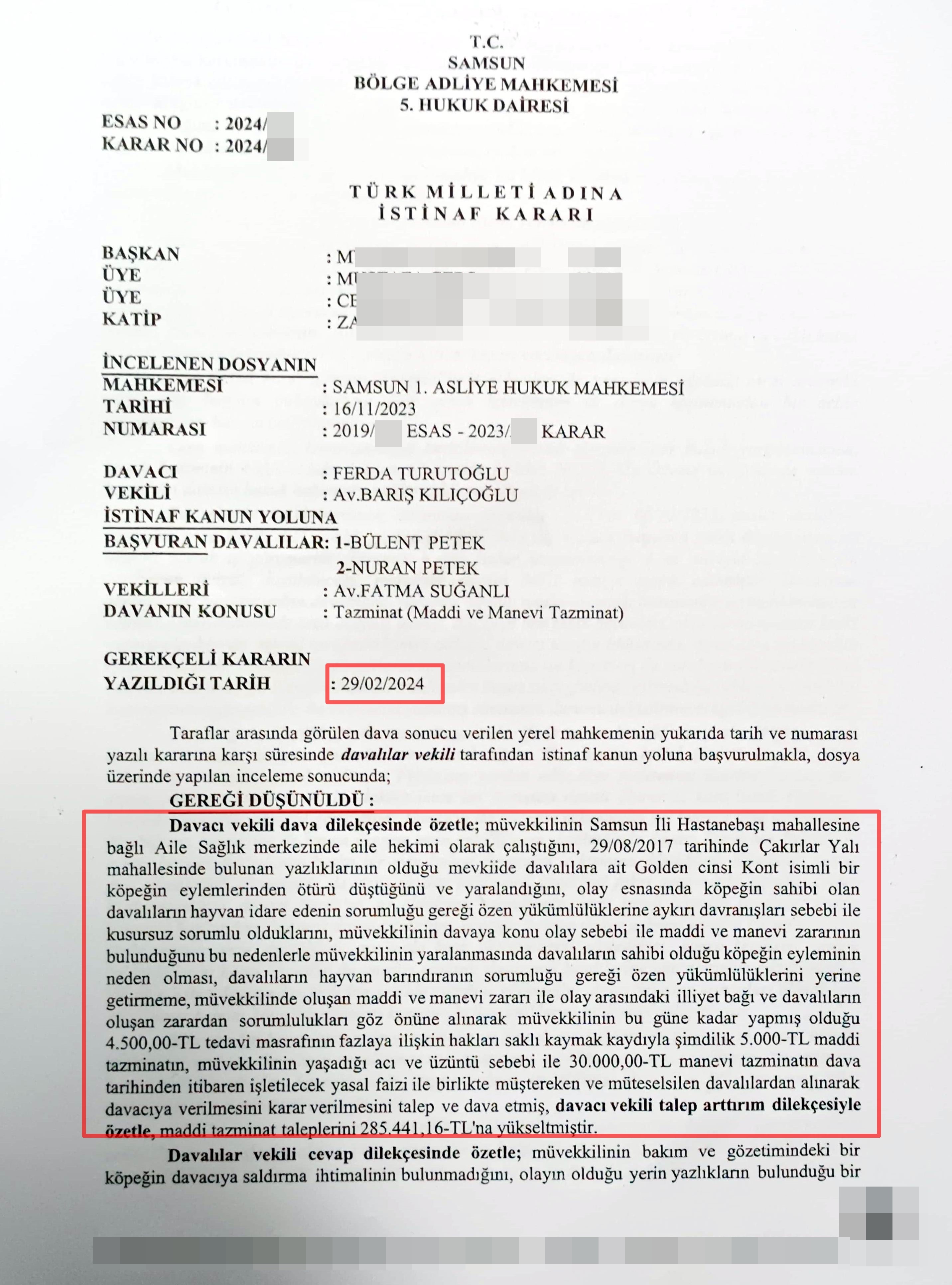 Söz konusu dosyanın kalıcı olarak kendileri lehine sonuçlandığını açıklayan davacı Ferda Turutoğlu'nun avukatı Barış Kılıçoğlu, "İstinaf lehimize sonuçlandı. Müvekkilim köpeğin saldırması sonucu duvardan düşüyor. Düşme sonucunda da dizinden ameliyat oluyor. Bacağında platinler var. Bununla ilgili tazminat davası görüldü, lehimize sonuçlandı. Karar, istinaftan da geçerek kesinleşti. Konuyla ilgili yargılama aşaması tamamlandı. Köpek, davalı tarafın köpeği. Bununla alakalı bir inkarları da olmadı. Dava da bu haliyle kesinleşti. Bundan sonra karar kesin olduğu için bir daha dava görülmeyecek. Dosya da icra aşamasında. Doktor Ferda Turutoğlu'nun olayın ardında yüzde 3,4 oranında maluliyeti var. Ayrıca dava karara çıktıktan kısa bir süre sonra davalı taraf üzerine kayıtlı taşınmazı yakın bir tanıdığına devretti. Bununla ilgili de dava açtık. Taşınmaza tedbir uygulandı. Tasarrufun iptali davası da ayrıca devam etmektedir. O davanın da yargılama aşamasının başındayız. Bu olayda 'hayvan idare edenin tazminat sorumluluğu' var. Dava özü itibarıyla hayvan idare edenin tazminat sorumluluğudur. Konunun başka alanlara çekilmesinin manası yok. Başıboş köpeklerle alakalı konularda idarenin sorumluluğu var. Orada kamu hizmeti işlememiş ya da kötü işlemiştir. Orada belediyenin sorumluluğu vardır. Bizim konumuzda ise hayvan sahibinin yasadan doğan sorumluluğu vardır. Bunların birbirine emsal teşkil etmesi konusunda birinde idarenin sorumluğu, diğerinde hayvan sahibinin sorumluluğu var. Özü itibarıyla aynı şeyler olsa da sorumluluk makamları farklıdır" ifadelerini kullandı.