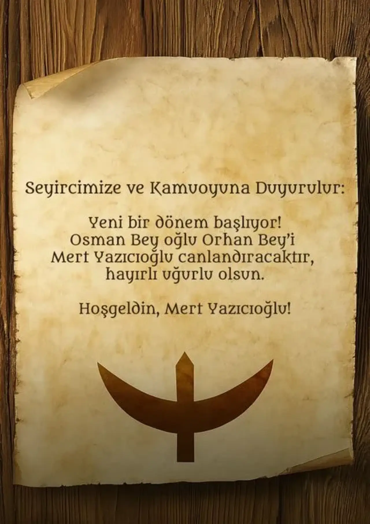 Türkçe ve İngilizce olarak yayımlanan açıklamada, "Yeni dönem başlıyor! Osman Bey oğlu Orhan Bey'i Mert Yazıcıoğlu canlandıracaktır, hayırlı uğurlu olsun. Hoş geldin, Mert Yazıcıoğlu!" ifadelerine yer verildi.  Bu gelişme, dizinin sevenleri tarafından da büyük bir heyecanla karşılandı.