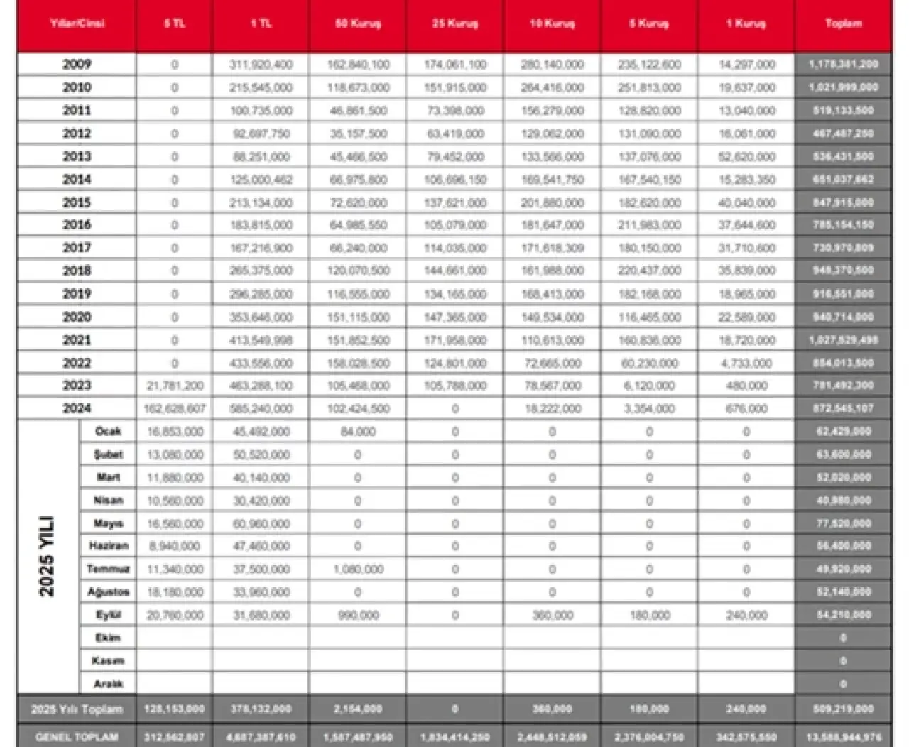 Daha önce maliyet gerekçesiyle üretimi durdurulduğu iddia edilen 50 kuruşluk madeni paradan ise 990 bin adet basıldı. Darphane verilerine göre, TL’den “yeni” ibaresi kaldırıldıktan sonra 1 Ocak 2009’dan bu yana tedavüle sokulan madeni paralarda toplam bozuk para sayısı 13 milyar 588 milyon 944 bin 976 adede ulaştı. Bu dönemde en fazla bulunan madeni para 1 lira oldu; 4 milyar 687 milyon 387 bin 610 adet ile en yaygın şekilde taşınıyor.