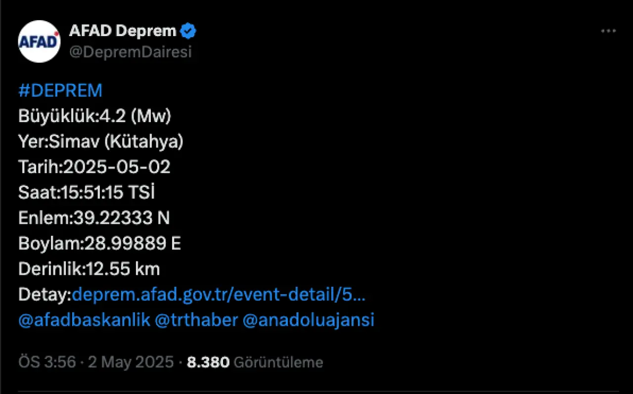 Afet ve Acil Durum Yönetimi Başkanlığı (AFAD) verilerine göre, 2 Mayıs 2025 tarihinde Kütahya'nın Simav ilçesinde saat 15.51’de 4.2 büyüklüğünde bir deprem meydana geldi. Depremin yerin 12.55 kilometre derinliğinde gerçekleştiği bildirildi.
