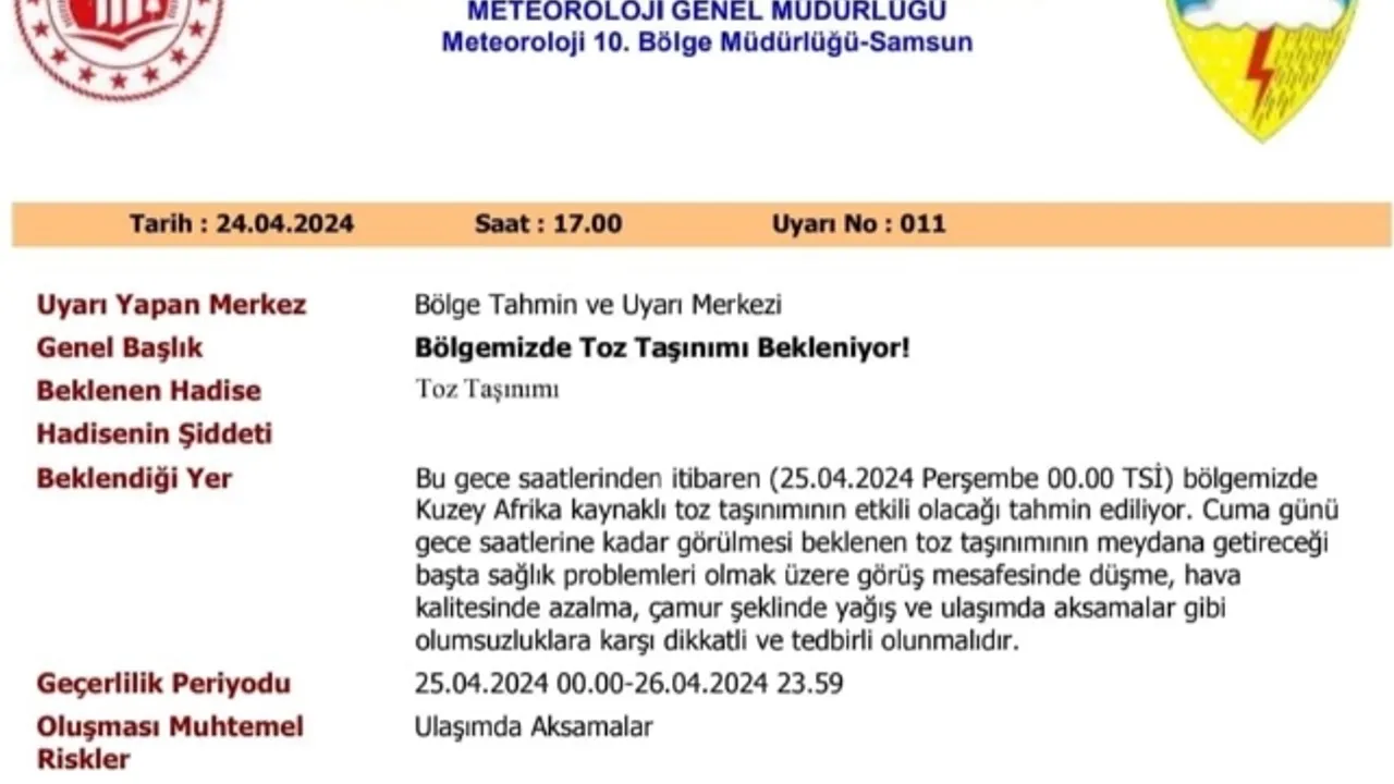 “25 Nisan 00.00 ile 26 Nisan 23.59 arası; Kuzey Afrika kaynaklı toz taşınımının etkili olacağı tahmin ediliyor. Cuma günü gece saatlerine kadar görülmesi beklenen toz taşınımının meydana getireceği başta sağlık problemleri olmak üzere görüş mesafesinde düşme, hava kalitesinde azalma, çamur şeklinde yağış ve ulaşımda aksamalar gibi olumsuzluklara karşı dikkatli ve tedbirli olunmalıdır. İlgililere ve vatandaşlarımıza önemle duyurulur.”
