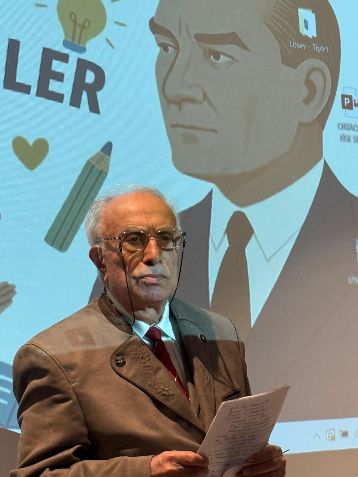 Programda ilk konuşmayı yapan emekli sınıf öğretmeni Ekrem Özbey, öğretmenliğin önemine dikkat çekerek, “Öğretmenlik mesleği bir tanrı mesleğidir. Çocuklarımız milletimizin çekirdeğidir. Ne kadar iyi yetiştirirsek o kadar güçlü bir millet doğar. Atatürk’ün sözüyle devam etmek istiyorum: ‘Muaillimler, yeni nesi sizin eseriniz olacaktır!’ Ben de öğretmenlerimize, Atatürk’ü duyalım, bu güzel sözlerine harfiyen uyalım, diyorum. Sevgili öğretmenlerim, bunlar sizin elinizde. Hepinizin gününü tekrar kutluyorum” sözünü hatırlatarak tüm öğretmenlerin gününü kutladı ve etkinliğe özel yazdığı şiirini okudu.