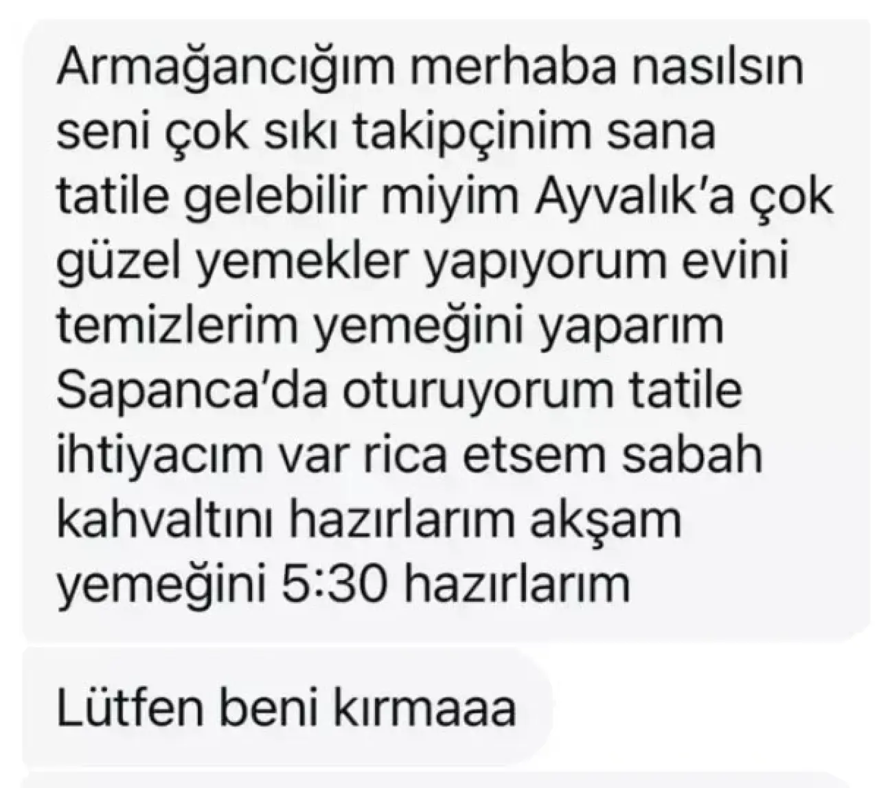Armağan Çağlayan, kişisel Instagram hesabından yaptığı paylaşımda; hayret uyandıran bir mesajı ifşaladı. Ayvalık'ta yaşayan Çağlayan, takipçisinin kendisine tatile gelmek istediğine yönelik attığı mesajları paylaştı.