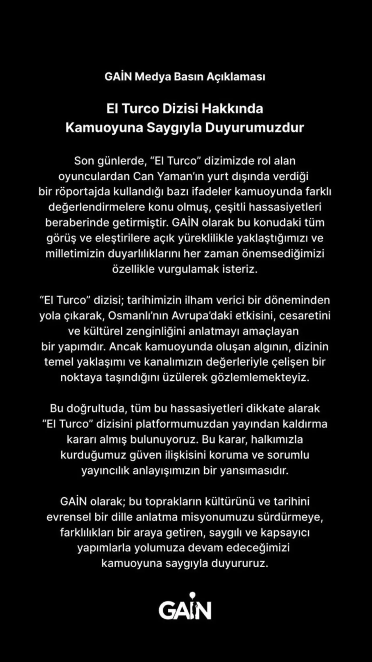 Başrolünde Can Yaman’ın yer aldığı ve üç yıl önce Disney Plus için çekilen El Turco dizisi, bu kez de Gain platformunda yayın serüvenine nokta koydu. Platform, diziyi oyuncunun verdiği bir röportaj nedeniyle yayından kaldırdığını duyurdu.