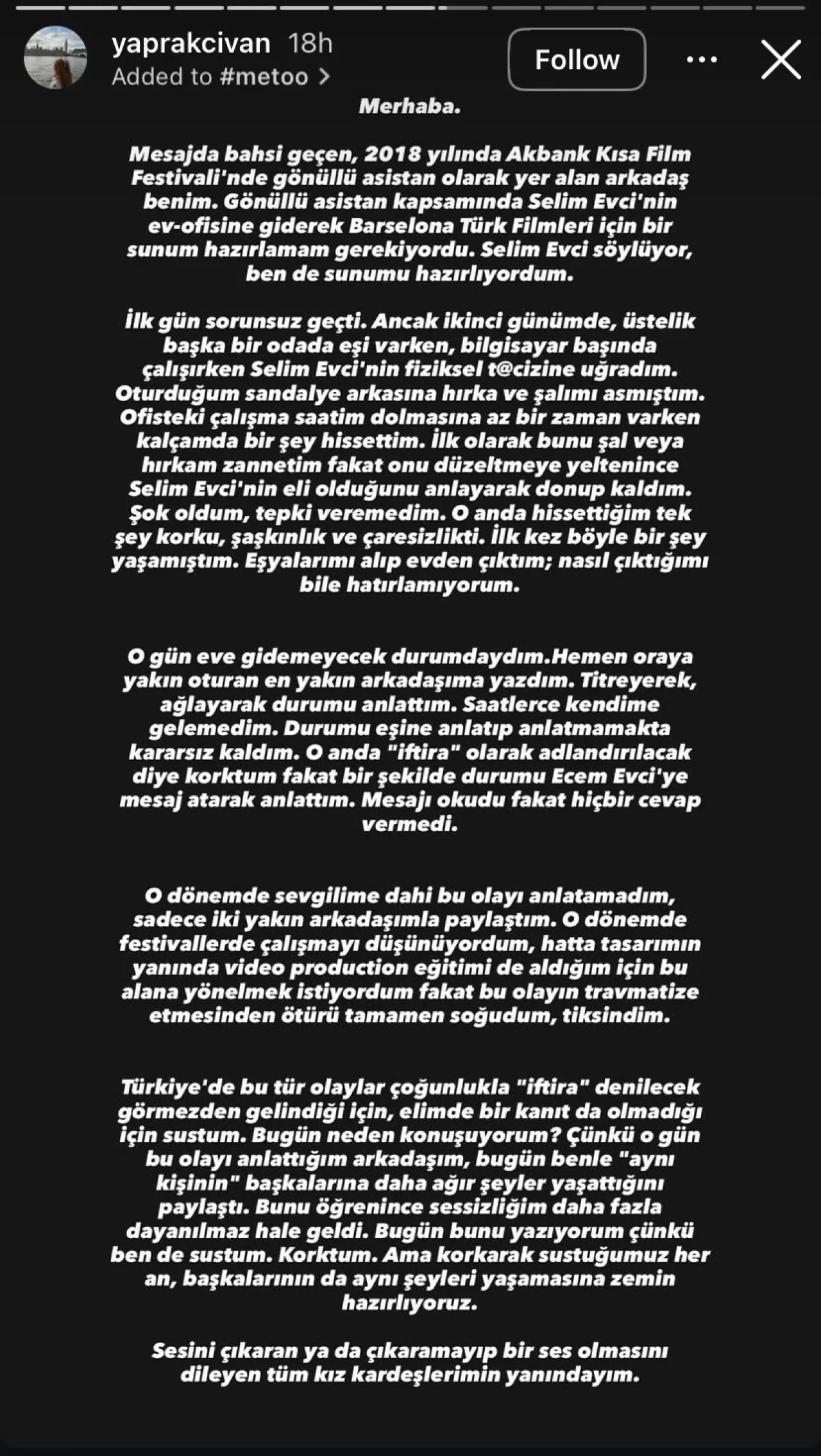 Yönetmen Selim Evci hakkında tasarımcı Yaprak Civan tarafından ortaya atılan taciz iddiası, kültür ve sanat dünyasında büyük yankı uyandırdı. İddiaların ardından dijital yayın platformu MUBI, Evci’ye ait filmleri yayından kaldırırken, Akbank Sanat da ilişkisini sonlandırdı ve 22. Kısa Film Festivali’ni iptal etti.