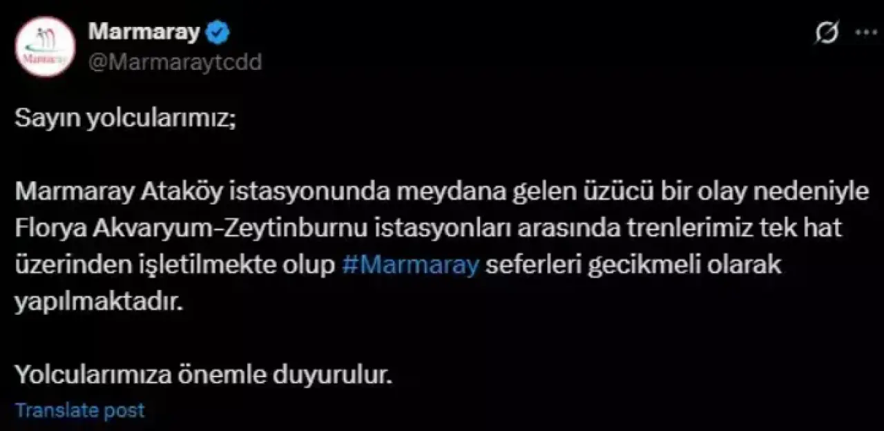 Marmaray Ataköy istasyonunda meydana gelen üzücü bir olay nedeniyle Florya Akvaryum-Zeytinburnu istasyonları arasında trenlerimiz tek hat üzerinden işletilmekte olup Marmaray seferleri gecikmeli olarak yapılmaktadır. Yolcularımıza önemle duyurulur.”