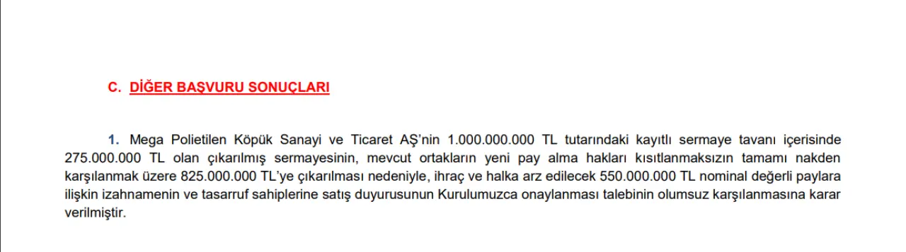 Mega Polietilen Yönetim Kurulu ise aldığı kararla şirketin bedelli sermaye artırımına gitmesi yönünde hamle yapmıştı. Şirket Yönetim Kurulu tarafından alınan karar MAEGAP KAP sayfası üzerinden duyurulmuş ve Sermaye Piyasası Kurulu başta olmak üzere yasal mercilere gerekli başvurular yapılmıştı.