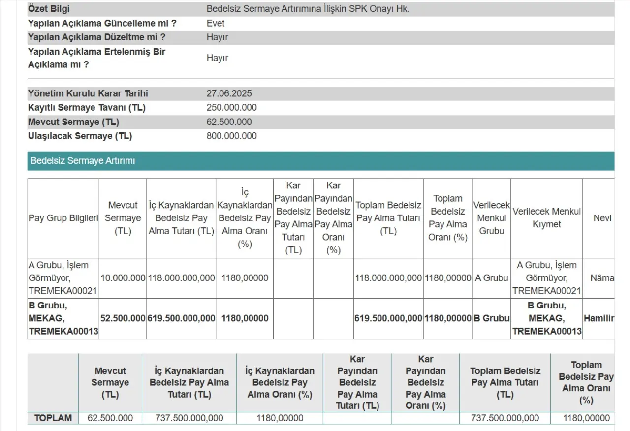 Meka Global Makine İmalat Sanayi ve Ticaret A.Ş. Yönetim Kurulu tarafından firmanın sermayesinin 62,5 milyon liradan yüzde 1160 oranında artırılarak 800 milyon liraya çıkarılması kararı alınmıştı. 737,5 milyon liralık sermaye artırım tutarının şirketin iç kaynaklarından karşılanacağı deklare edilmişti. Bu konuda Sermaye Piyasası Kurulu’na yapılan başvuru, geçtiğimiz hafta yayımlanan haftalık SPK bülteni ile onaylandı. İşte detaylar…