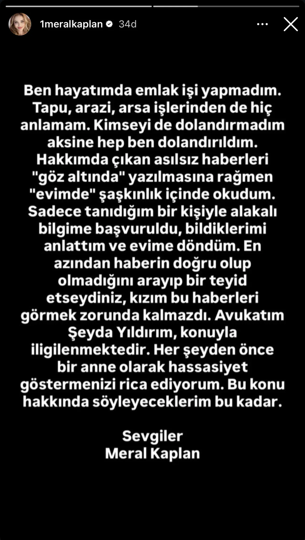 “Hayatımda arsa işi yapmadım. Kimseyi dolandırmadım, aksine hep ben dolandırıldım. Hakkımda çıkan asılsız haberleri şaşkınlıkla evimde okudum. Konuyu avukatım takip ediyor. Bir anne olarak kamuoyundan hassasiyet rica ediyorum.”