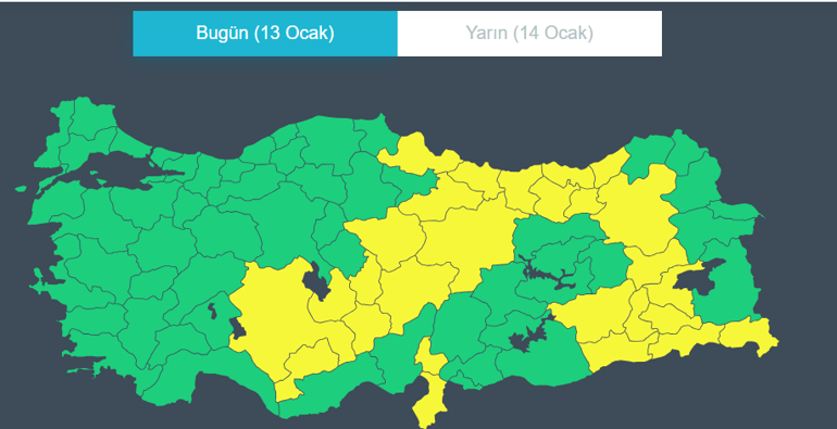 Meteoroloji Genel Müdürlüğü, 13 Ocak Salı gününe ilişkin hava durumu raporunu yayımladı. Rapora göre, yurt genelinde kuvvetli kar yağışı, sağanak ve fırtına beklenirken 27 il için sarı kodlu meteorolojik uyarı yapıldı.