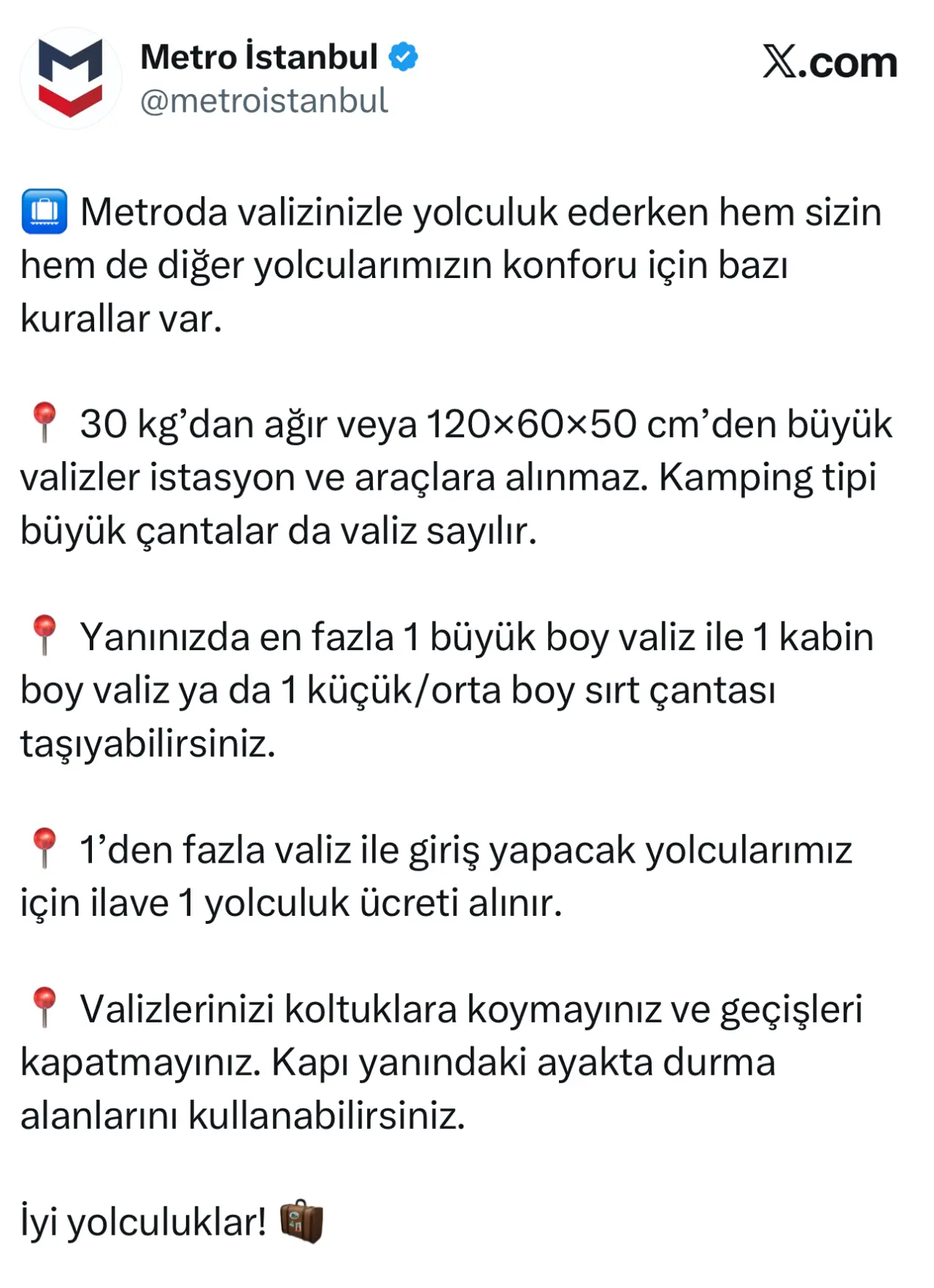 Metro İstanbul’un yaptığı bilgilendirmeye göre, 30 kilogramı aşan veya 120×60×50 santimetreden büyük ebatlara sahip valizler istasyon ve araçlara alınmayacak. Açıklamada, kamp tipi büyük çantaların da valiz kategorisinde değerlendirileceği belirtildi. Uygulama kapsamında, yolcuların yanında en fazla bir büyük boy valiz ile bir kabin boy valiz ya da bir küçük/orta boy sırt çantası bulundurmasına izin verilecek.