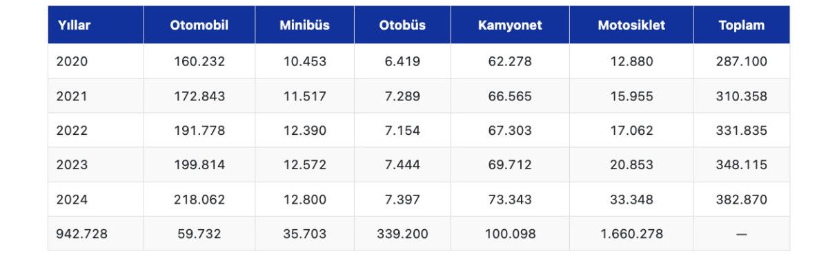 Otomobiller, kat edilen toplam yolun yarısından fazlasını oluştururken, 2020-2024 döneminde bu araçlar toplam 942 milyar 728 milyon kilometre yol aldı. Otomobilleri 339 milyar 200 milyon kilometre ile kamyonetler takip etti.