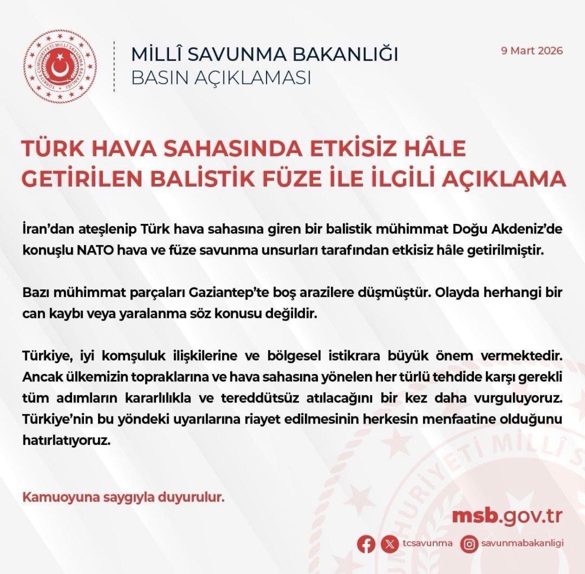Milli Savunma Bakanlığı, İran'dan ateşlenen ve Türk hava sahasına giren bir balistik füzenin NATO savunma unsurları tarafından etkisiz hale getirildiğini açıkladı. İmha edilen mühimmatın parçaları Gaziantep’te boş arazilere düşerken, olayda herhangi bir can veya mal kaybı yaşanmadı.