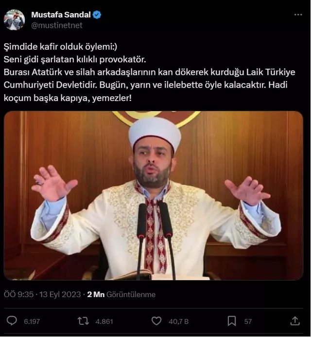 "Acilen müslümanla kafirin tanımı yapılsın. Dine girmek var, çıkmak da var... Bunu sokacağız akıllarına anlata anlata. Bizim görevimiz beyinlerini çatlatırcasına anlatmak. Müslüman buna denir, kafir buna denir" ifadelerini kullanan imama Mustafa Sandal sert çıktı.
