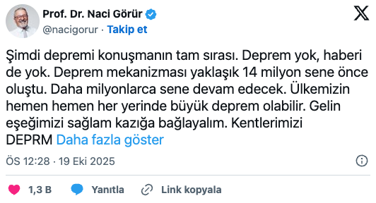 Deprem bilimci Prof. Dr. Naci Görür, yaptığı son açıklamada Türkiye’nin deprem kuşağında yer aldığını hatırlatarak, büyük depremlerin ülkenin her yerinde yaşanabileceğini vurguladı. “Deprem mekanizması yaklaşık 14 milyon yıl önce oluştu, daha da milyonlarca yıl sürecek. Bu nedenle artık konuşmanın değil, önlem almanın zamanı geldi” dedi.