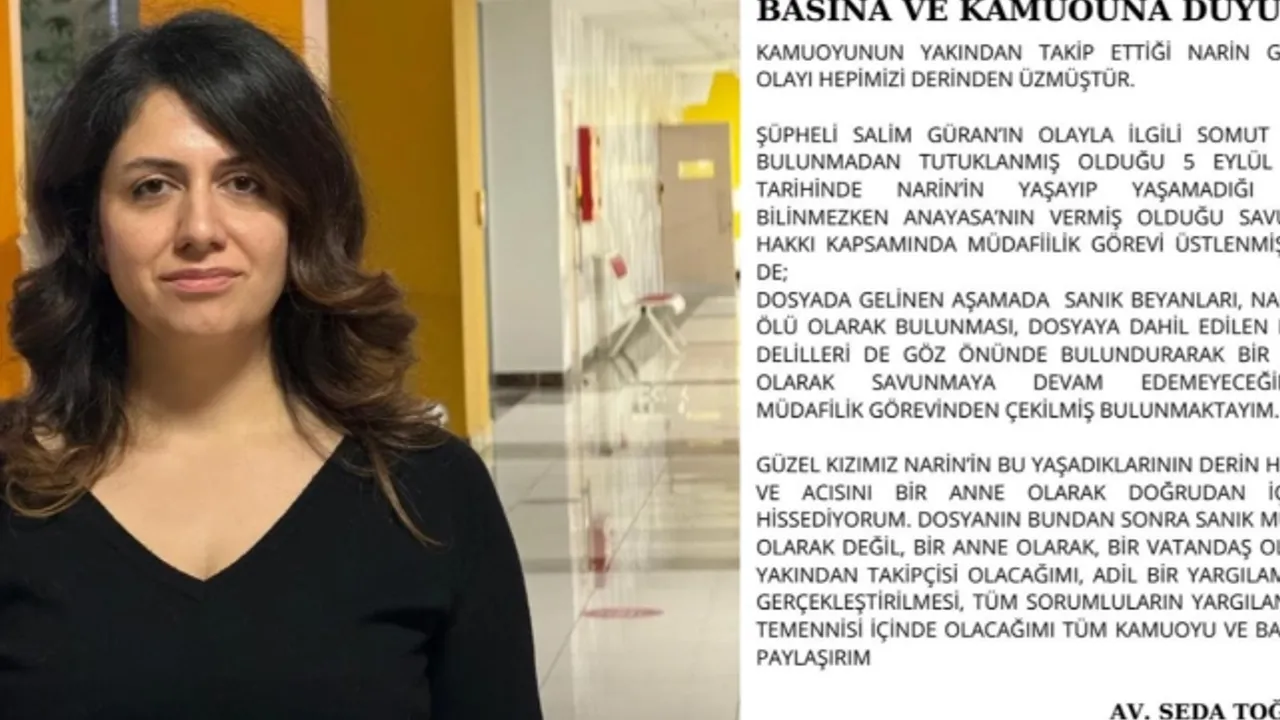 “Kamuoyunun yakından takip ettiği Narin Güran olayı hepimizi derinden üzmüştür. Şüpheli Salim Güran'ın olayla ilgili somut delil bulunmadan tutuklanmış olduğu 5 Eylül 2024 tarihinde Narin'in yaşayıp yaşamadığı dahi bilinmezken anayasanın vermiş olduğu savunma hakkı kapsamında müdafilik görevi üstlenmiş isek de; dosyada gelinen aşamada sanık beyanları, Narin'in ölü olarak bulunması, dosyaya dahil edilen diğer delileri de göz önünde bulundurarak bir anne olarak savunmaya devam edemeyeceğimden müdafilik görevinden çekilmiş bulunmaktayım. Güzel kızımız Narin'in bu yaşadıklarının derin hüznü ve acısını bir anne olarak doğrudan içimde hissediyorum. Dosyanın bundaki sonraki müdafi olarak değil, bir anne olarak, bir vatandaş olarak yakından takipçisi olacağım. Adil bir yargılamanın gerçekleştirilmesi, tüm sorumluların yargılanması temennisi içinde olacağım.”