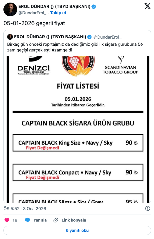 Tekel Bayileri Yardımlaşma Derneği Başkanı Erol Dündar, sosyal medya hesabından yaptığı paylaşımla fiyat artışını kamuoyuna duyurdu. Dündar, daha önce işaret edilen zammın ilk sigara grubunda uygulanmaya başlandığını belirterek, yeni fiyat etiketlerinin satış noktalarında görülmeye başladığını ifade etti.
