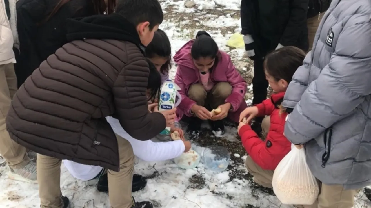 Çorum'da ortaokul öğrencileri, soğuk hava ve kar yağışı sebebiyle yiyeyecek bulunamayan hayvanlar için doğaya yiyecek ve su bıraktı.