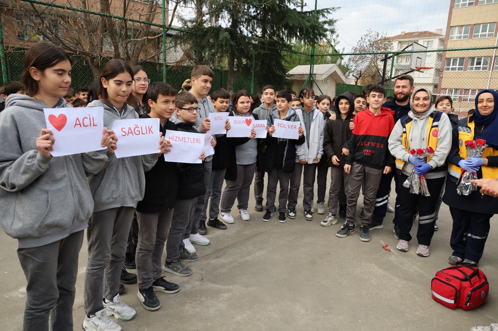 Bafra İlçe Sağlık Müdürlüğü 112 acil ambulans ekibi de yangın tatbikatında görev alarak temsili olarak yaralanan öğrencilere müdahalede bulundu. Öğrenciler ise sağlık ekibine arkadaşlarının rahatsız olduğunu söyleyerek görevlileri arkadaşlarının yanında çağırdı. Görevliler olay yerine geldiğinde ise öğrenciler bir sürpriz yaparak “Acil Sağlık Hizmetleri Günü” dolayısıyla onlara karanfil sundu.