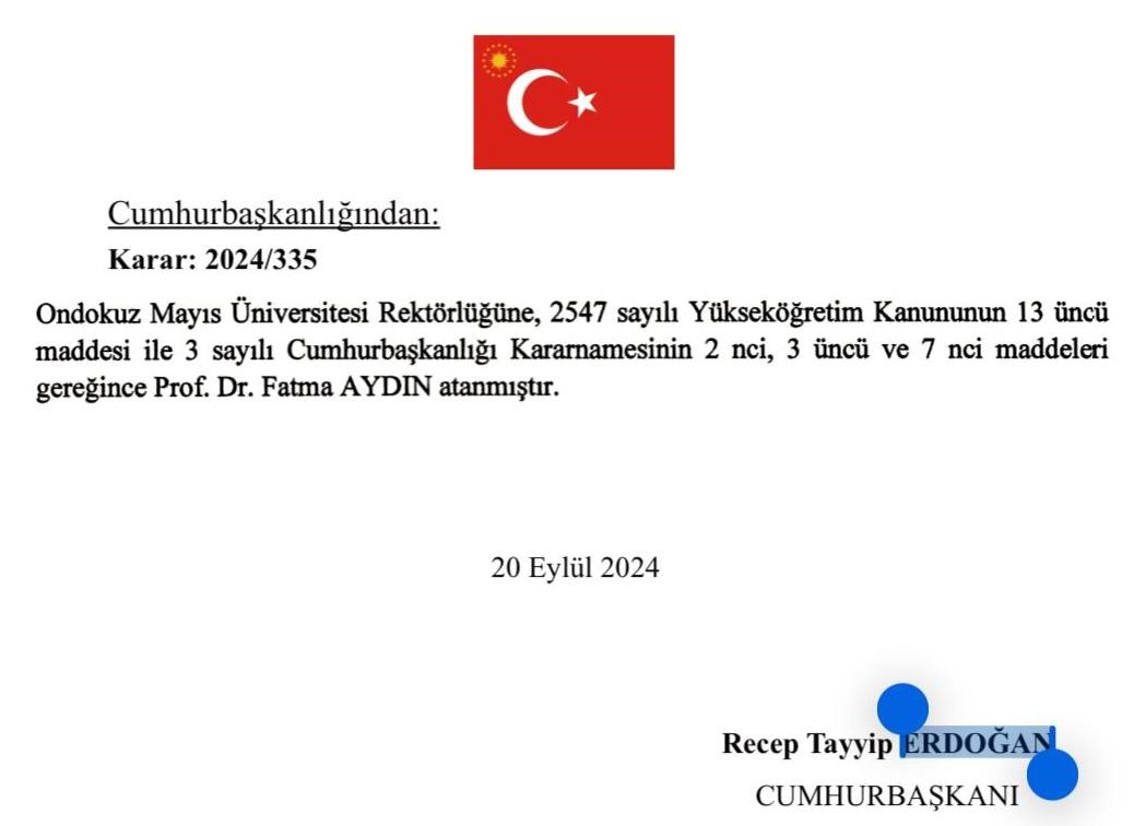 Cumhurbaşkanlığı'nın 2024/335 sayılı kararı yayımlandı. 20 Eylül tarihli Resmi Gazete'de yayımlanan kararda, “Ondokuz Mayıs Üniversitesi Rektörlüğü'ne 2547 sayılı Yükseköğretim Kanunu'nun 13'üncü maddesi ile 3 sayılı Cumhurbaşkanlığı Kararnamesi'nin 2'nci, 3'üncü ve 7'nci maddeleri gereğince Prof. Dr. Fatma Aydın atanmıştır” denildi.