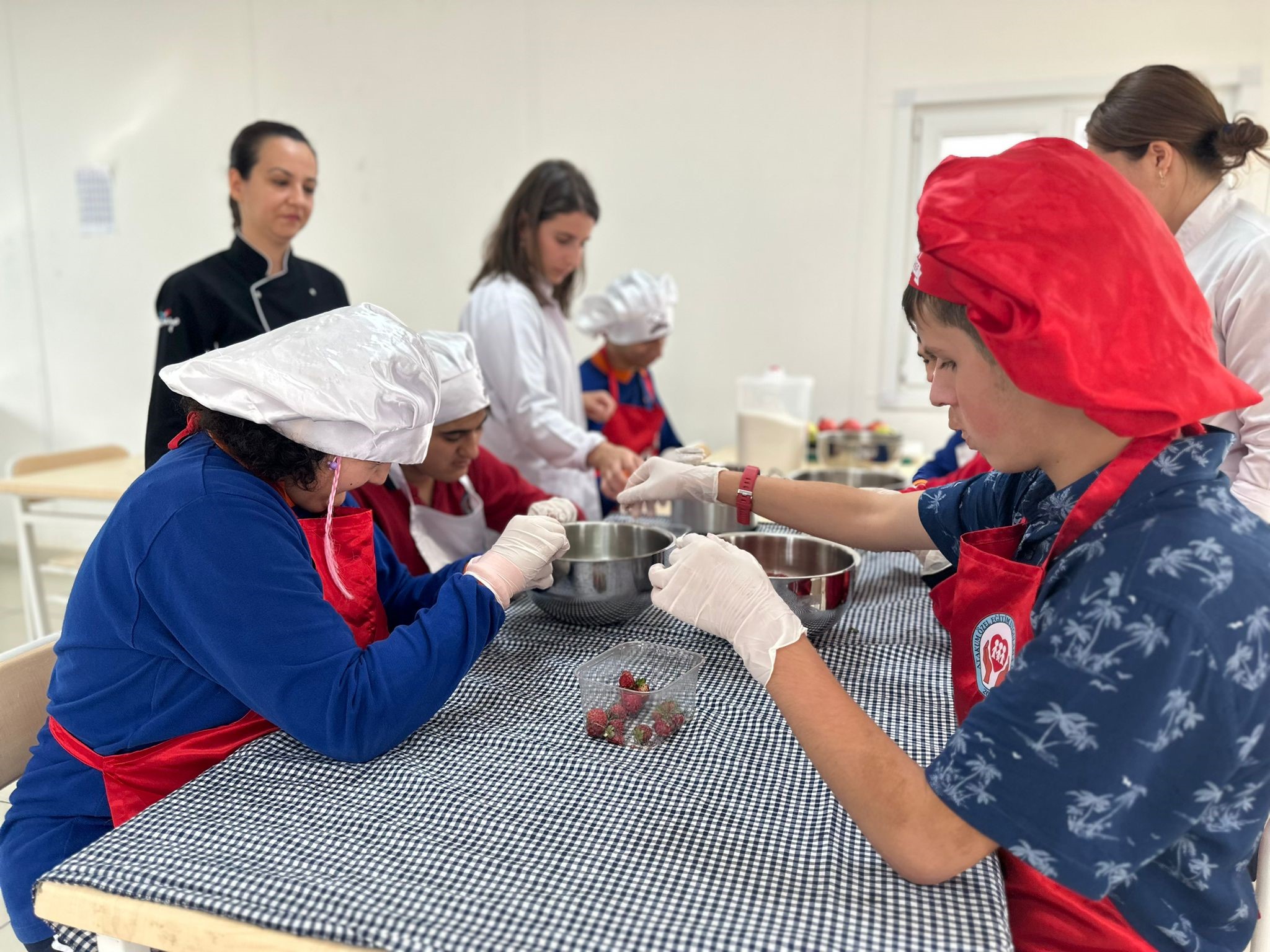 Okulun Yiyecek İçecek Hizmetleri Öğretmeni Şeyma İkiz, “Öğrencilerimizle çilek reçeli hazırlıyoruz. Seramızda birçok ürün üretiliyor. Yeşilliklerimiz var, ayrıca çilek ektiler. Orada çıkan yeşillikleri topluyoruz ve burada salatalar hazırlıyoruz. Çilek reçellerimizin içine o çileklerden bir kısmını koyuyoruz ve kullanıyoruz” diye konuştu.