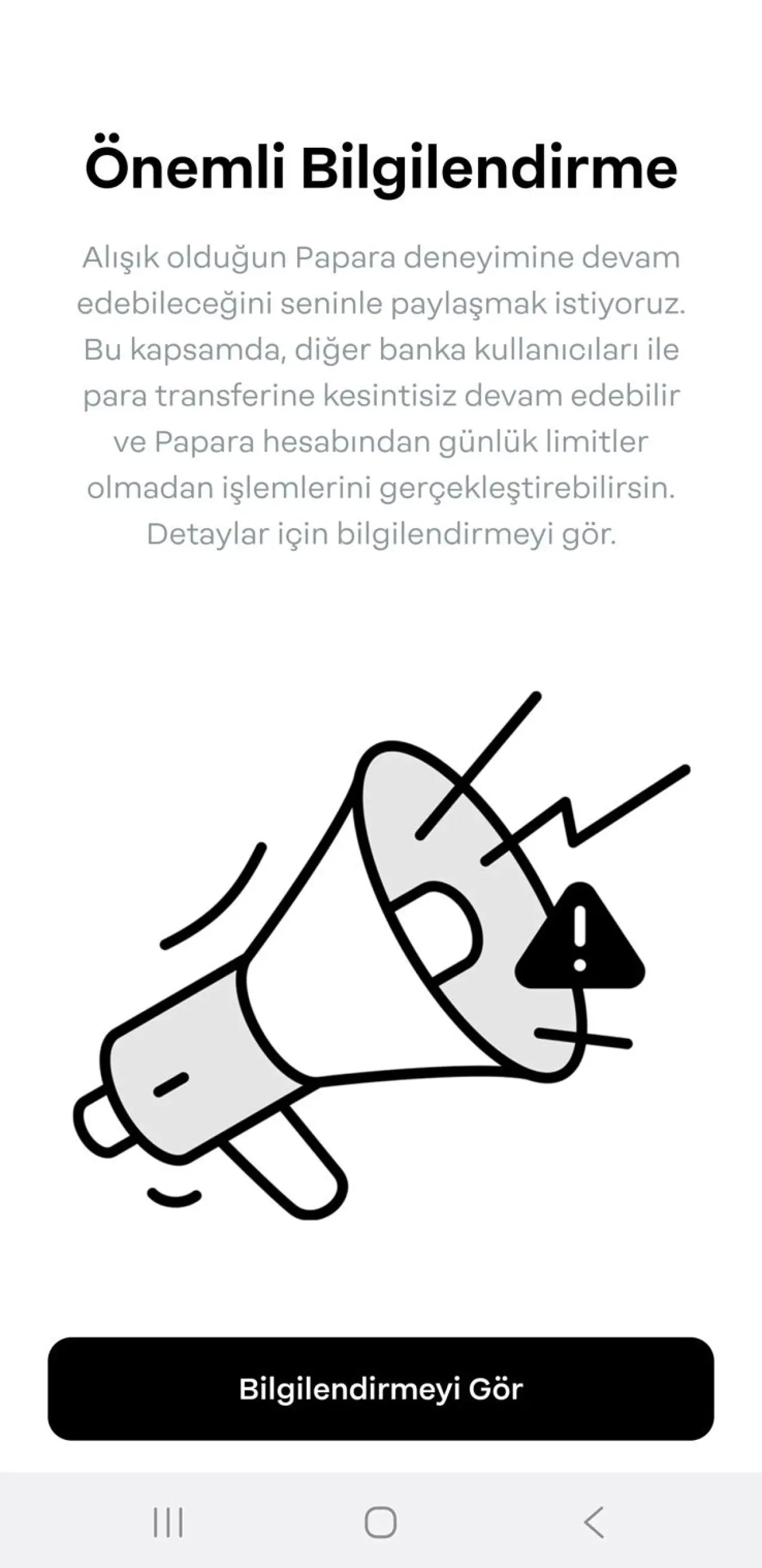 “Alışık olduğun Papara deneyimine devam edebileceğini seninle paylaşmak istiyoruz. Bu kapsamda, diğer banka kullanıcıları ile para transferlerine kesintisiz devam edebilir ve Papara hesabından günlük limitler olmadan işlemlerini gerçekleştirebilirsin.”