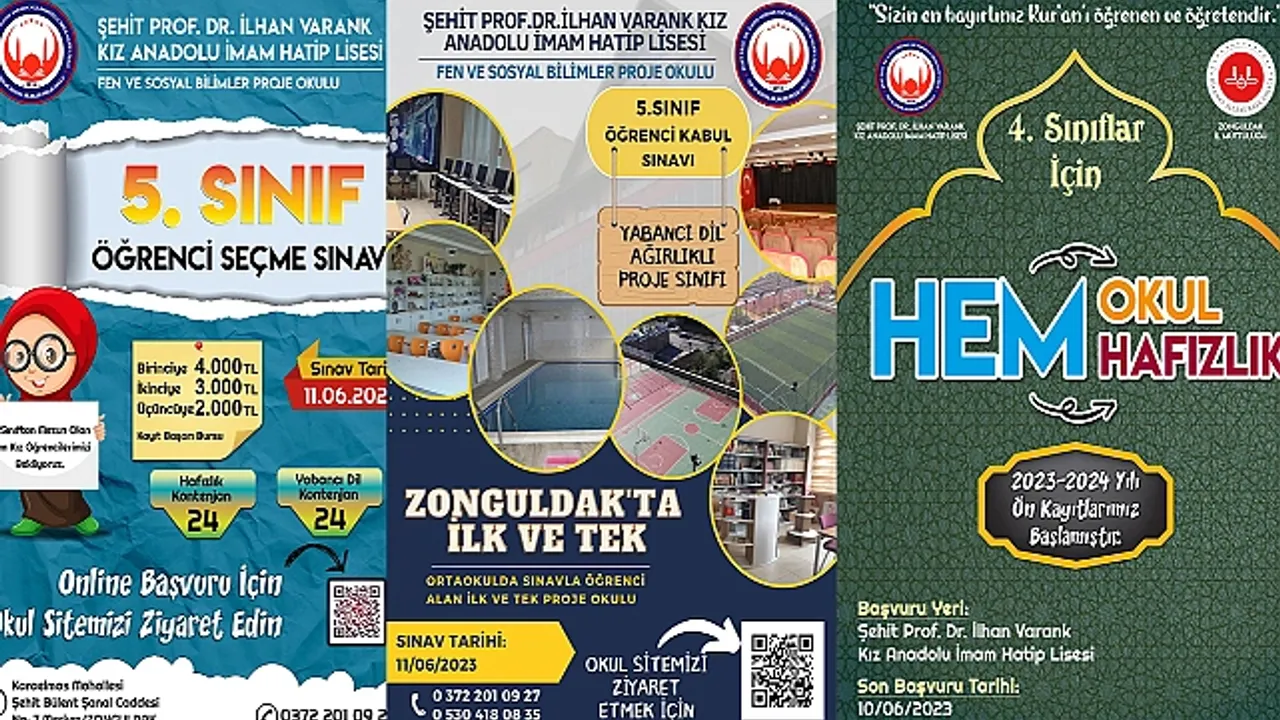 Zonguldak’ta ortaokula sınavla öğrenci alan tek okul olma özelliğine sahip olan Şehit Prof. Dr. İlhan Varank İmam Hatip Lisesinin Ortaokul kısmındaki proje sınıflarına 4.sınıfı bitiren 5. sınıfa başlayacak kız öğrenciler müracaat edebilecekler. Proje okul başvuruları, öğrencinin bulunduğu ilkokul idaresi ya da online olarak