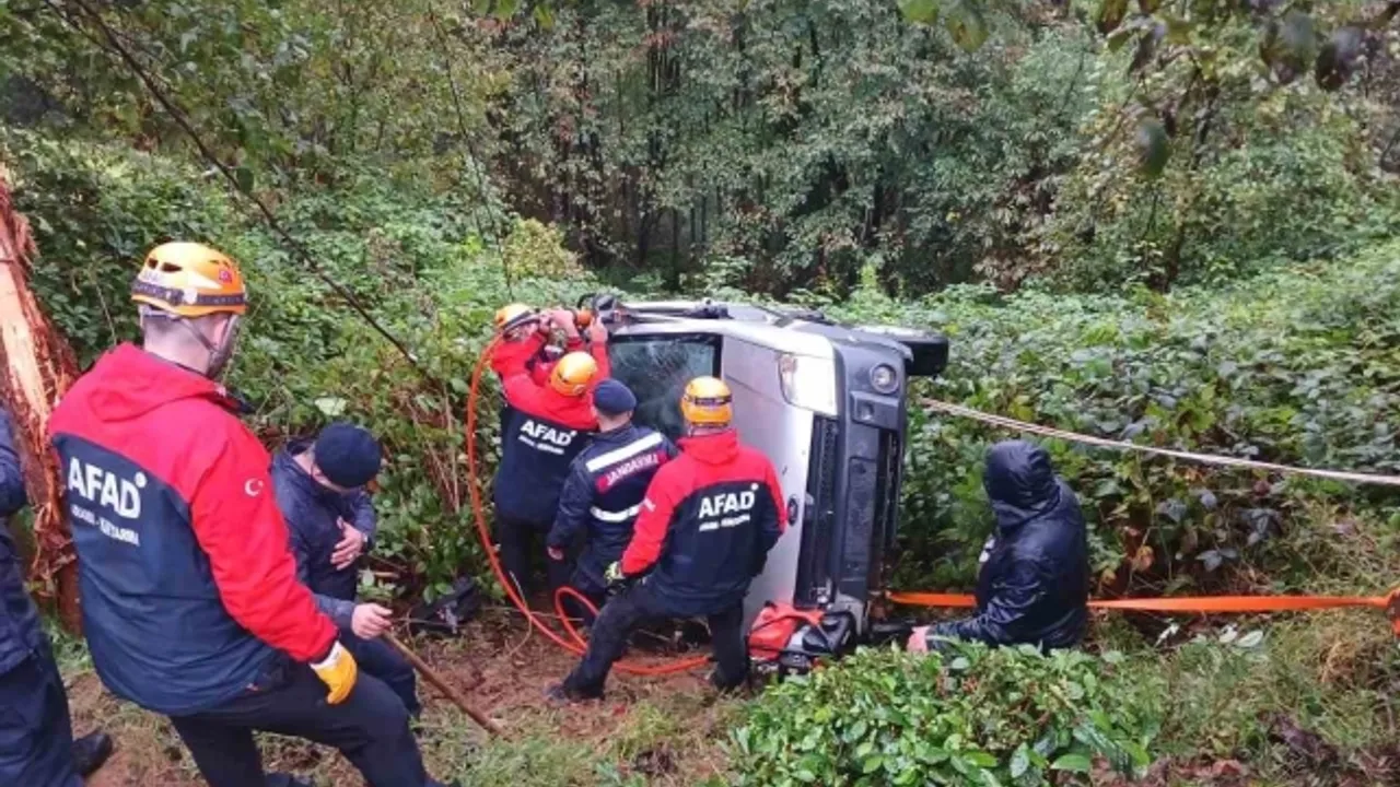 Rize'nin Çayeli ilçesinde uçurma yuvarlanarak askıda kalan aracın şoförü ekiplerin müdahalesiyle araçtan çıkarıldı.