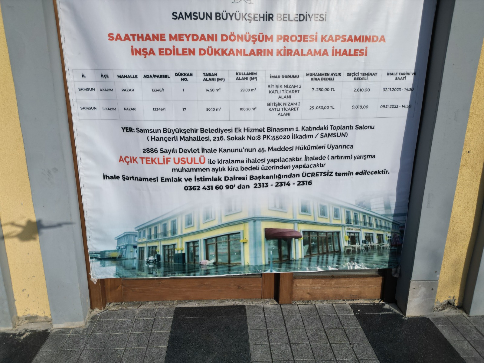 Samsun Büyükşehir Belediyesi tarafından Saathane Meydanı Dönüşüm Projesi kapsamında inşa edilen iki dükkan için kiralama ihalesi yapılacak. 14,50 metrekare taban alanı 29 metrekare kullanım alanı bulunan dükkan için 02 Kasım 2023 günü saat 14:30’da, 50,10 metrekare taban alanı 100,20 metrekare kullanım alanı bulunan bir diğer dükkan için ise 09 Kasım 2023 günü saat 14:30’da yapılacak ihaleler açık teklif usulü ile gerçekleştirilecek.