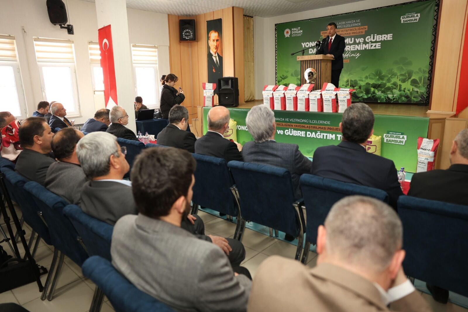 Programda konuşan Samsun Büyükşehir Belediye Başkanı Halit Doğan, “Samsun; doğasıyla, kültürüyle ve üretim gücüyle eşsiz bir mozaik şehirdir. Bu mozaiği asıl anlamlı kılan ise Lâdik’ten Vezirköprü’ye, Havza’dan Asarcık’a kadar bu toprakları nasırlı elleriyle işleyen üreticilerimizin emeğidir. Yem Bitkileri Yetiştiriciliğinin Yaygınlaştırılması Projesi kapsamında Yonca Tohumu ve Gübre Dağıtım Töreni’ni gerçekleştirdik. Bugün, bir yıl önce Vezirköprü’de verdiğimiz o sözün arkasında durmanın haklı gururunu yaşıyoruz. Üreticimiz yeter ki üretsin. Biz her zaman, her koşulda onların yanında olmaya, yükünü paylaşmaya devam edeceğiz. Bu vesileyle, projemizde emeği geçen tüm çalışma arkadaşlarıma teşekkür ediyor; üreticilerimizin tohumlarının bereketli, hasadının bol, kazancının daim olmasını diliyorum” ifadelerini kullandı.