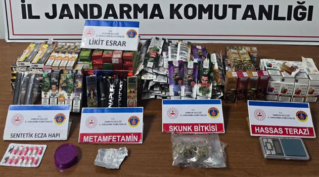 Arama sonucunda, 231 adet elektronik sigara görünümlü 200 gram likit esrar, 1 gram metamfetamin, 1.5 gram kubar esrar, 12 sentetik ecza hap, 30 gram skunk, uyuşturucu öğütme aparatı, hassas terazi ve uyuşturucu madde kullanma aparatı ele geçirildi.