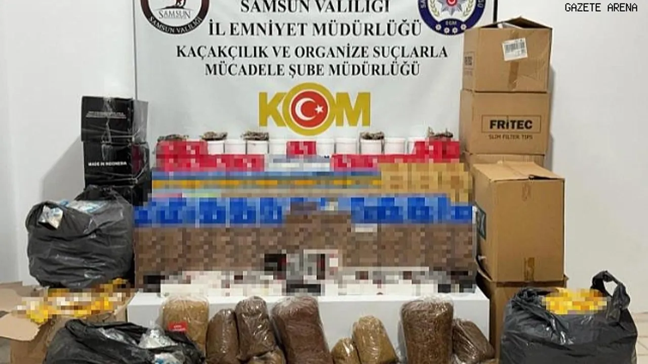 Edinilen bilgiye göre, Samsun Cumhuriyet Başsavcılığı koordinesinde kaçakçılık suçlarıyla mücadele kapsamında çalışma yapan Samsun Emniyet Müdürlüğü Kaçakçılık ve Organize Suçlarla Mücadele (KOM) Şube Müdürlüğü ekipleri, tütün mamullerine yönelik operasyon gerçekleştirdi. Atakum, İlkadım ve 19 Mayıs ilçelerinde bugün yapılan aramalarda 6 bin 200 adet doldurulmuş makaron sigara, 23 bin 200 adet boş makaron, 5 bin 799 paket sigara sarma kağıdı, 399 bin 600 adet sigara filtresi, 445 paket nargile tütünü, 4 adet elektronik sigara, 11 adet paketlenmiş tütün, 47 bin 750 gram açık kıyılmış tütün, 43 adet tabanca fişeği ve 1 adet amaç dışı bıçak ele geçirildi. Olayla ilgili 4 kişi yakalandı.