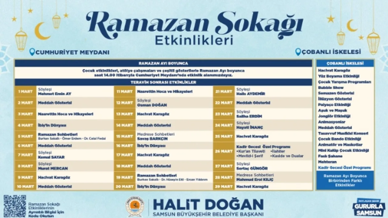 Ramazan Ayı boyunca, Samsun Büyükşehir Belediyesi’nin düzenlediği etkinlikler ile şehri dolu dolu bir Ramazan bekliyor. Cumhuriyet Meydanı'nda kurulacak olan Ramazan Sokağı, her gün saat 14.00 itibariyle başlayacak ve çocuklar için çeşitli geleneksel oyunlar ile atölye çalışmaları sunulacak. Çuval yarışı, yüz boyama, sandalye kapmaca gibi eğlenceli oyunların yanı sıra, çömlek yapımı, teravih çantası yapımı ve ahşap cami yapımı gibi geleneksel el sanatları atölyeleri de katılımcılara sunulacak. Karagöz ve Hacivat gölge oyunu, Nasrettin Hoca hikayeleri gibi gösteriler ise Türk tiyatrosunun en güzel örneklerini ziyaretçilere sunacak.