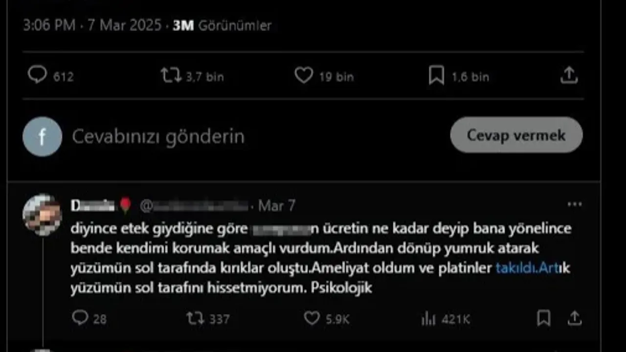 "Olay 5 Mart’ta yaşandı. Sokakta yürürken ilk önce bir şey dedi. Kulaklığım olduğu ve korktuğum için görmezden geldim. İkinci defa bir şey dediğinde sesi kısıp pardon ne dedin dedim. 'Ücretin ne kadar?' dediğinde tekrar pardon anlamadım dedim. 'Burası Atakent mi?' dedi. Ben ilk söylediğinde ne dediğini sorunca, 'Etek giydiğine göre ücretin ne kadar?' diyerek bana yöneldi. Kendimi korumak için vurdum. Ardından dönüp bana yumruk attı ve yüzümün sol tarafında kırıklar oluştu. Ameliyat oldum, platinler takıldı. Artık yüzümün sol tarafını hissetmiyorum. Psikolojik olarak kötü durumdayım, artık uyuyamıyorum. Kırıklarım sebebiyle yemek yiyemez hale geldim. Tek isteğim bu süreç boyunca destek olmanız."