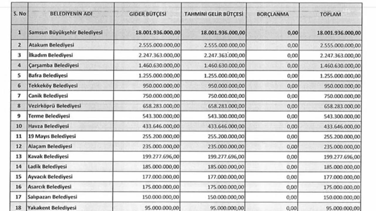 Samsun Büyükşehir Belediyesi (SBB) ve 17 ilçenin 2025 mali yılı toplam bütçeleri 30 milyar 326 milyon TL.