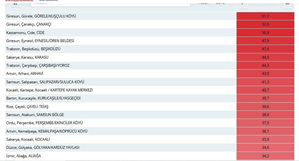 Samsun, bu miktarla Türkiye genelinde en fazla yağış alan iller arasında 6. sırada yer aldı. MGM verilerine göre, listenin başında Giresun, Kastamonu, Trabzon, Sakarya ve Artvin bulunuyor.