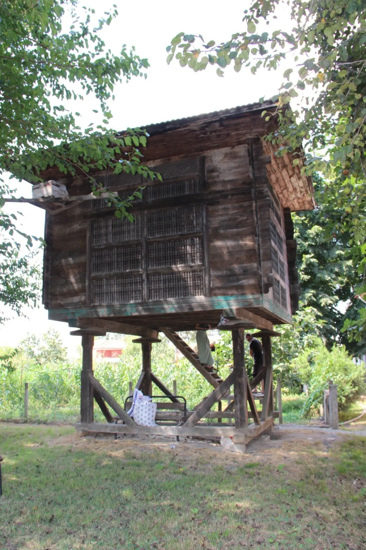 "Bu ahşap yapı Rize'den geldi. Eskiden mısır, fasulye gibi ürünleri saklamak için kullanılıyordu. Fare giremez, havadar yapısıyla erzaklar bozulmadan korunabiliyor. Şimdilerde fındık depoluyoruz."